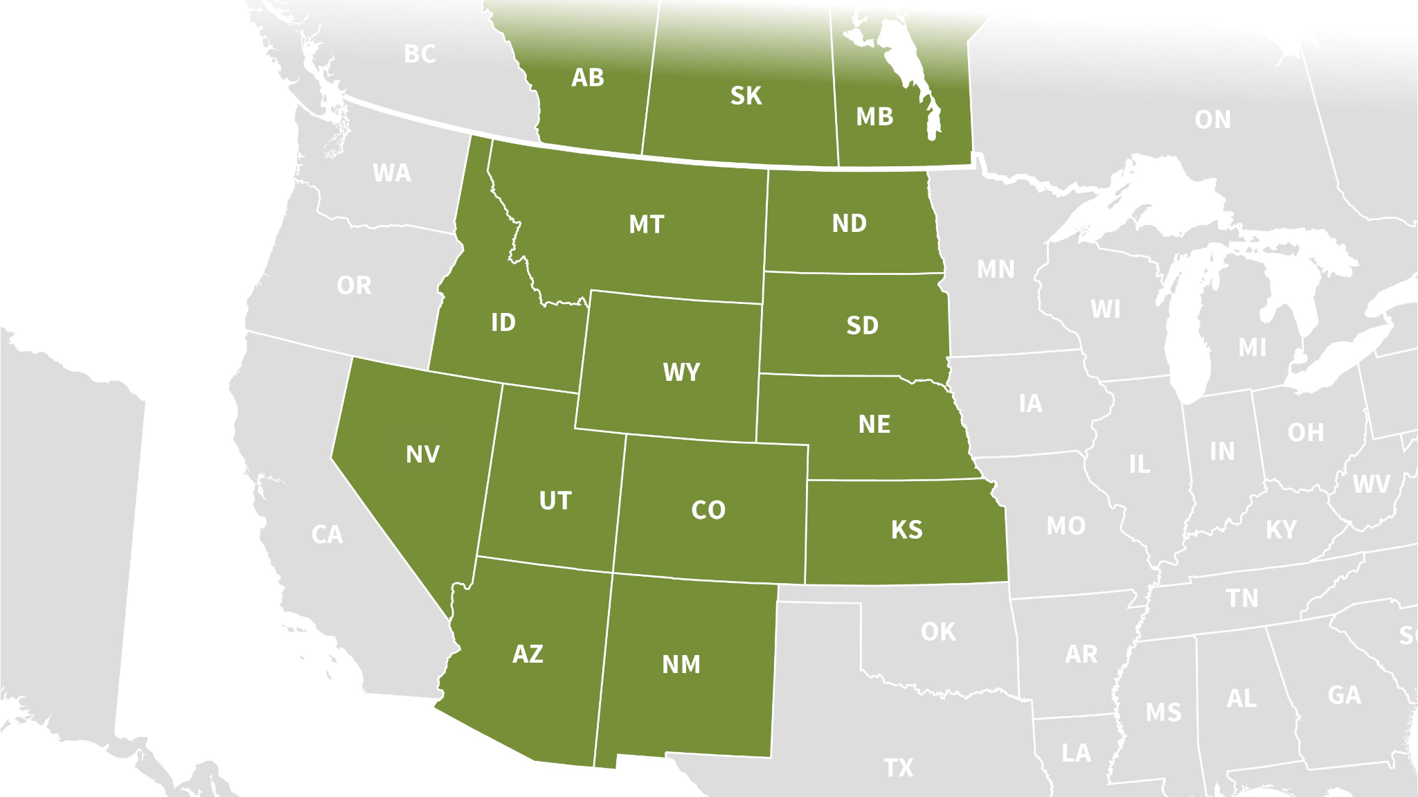 Alberta, Arizona, Colorado, Idaho, Kansas, Montana, Nebraska, Nevada, New Mexico, North Dakota, South Dakota, Utah and Wyoming